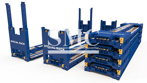 Flat rack containers may also be known as flat bed or platform containers. The two longest sides or walls that are formed of steel in general purpose or reefer containers are missing. They are characterized by the fact that they have no superstructure but instead have fixed or collapsible ends as well as lashing points for securing the cargo. The ends on this type of container, therefore, not only characterize the container but also define how they are packed, unpacked, stacked and stored.