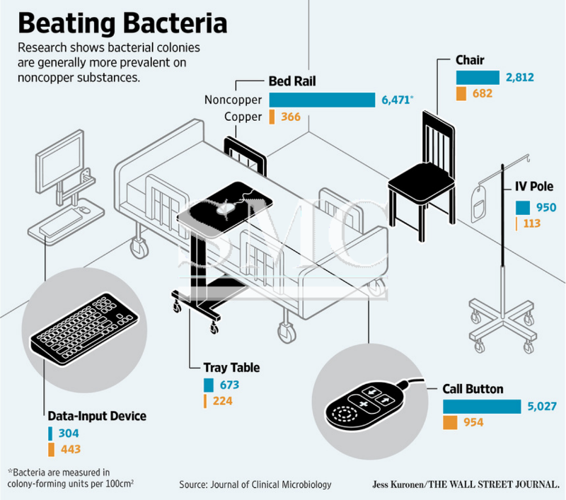 According to Stephanie Yang on WSJ, copper is used in everything from construction to electrical wiring, but it also has antimicrobial properties that kill 99.9% of bacteria on its surface within two hours, according to the Environmental Protection Agency. That makes it a potential weapon for combating the spread of infections in hospitals and public areas.