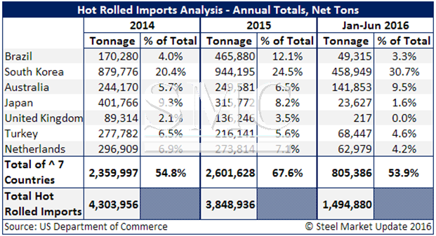 SMU shared the following data with our member companies last Tuesday but SMU thought it would be valuable for your understanding of the impact of these cases as SMU members discuss each of the countries listed below and if the adjustments made by the U.S. Department of Commerce could potentially affect hot rolled steel exports from these countries moving forward.