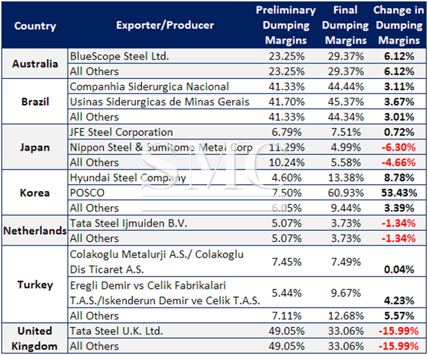 On Friday the U.S. Department of Commerce announced their final determination findings on hot rolled steel dumping margins and countervailing subsidy rates for Brazil, South Korea, Australia, Turkey, Japan, United Kingdom and the Netherlands. In the article above SMU reproduced the press release provided by the Commerce Department. In this article SMU are going to compare the preliminary determinations with the final and see if there are any surprises that could impact U.S. customers.