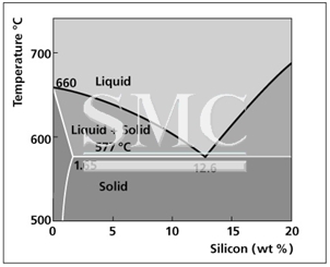 The melting characteristics of the cladding alloys are governed by the Al-Si phase diagram. The eutectic composition, i.e. the amount of Si required to produce the lowest melting point is 12.6%. The melting