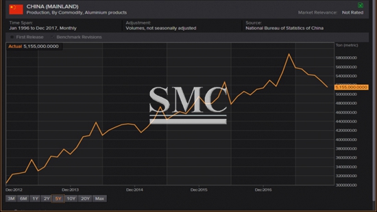 5 year trend of China's Aluminium Production