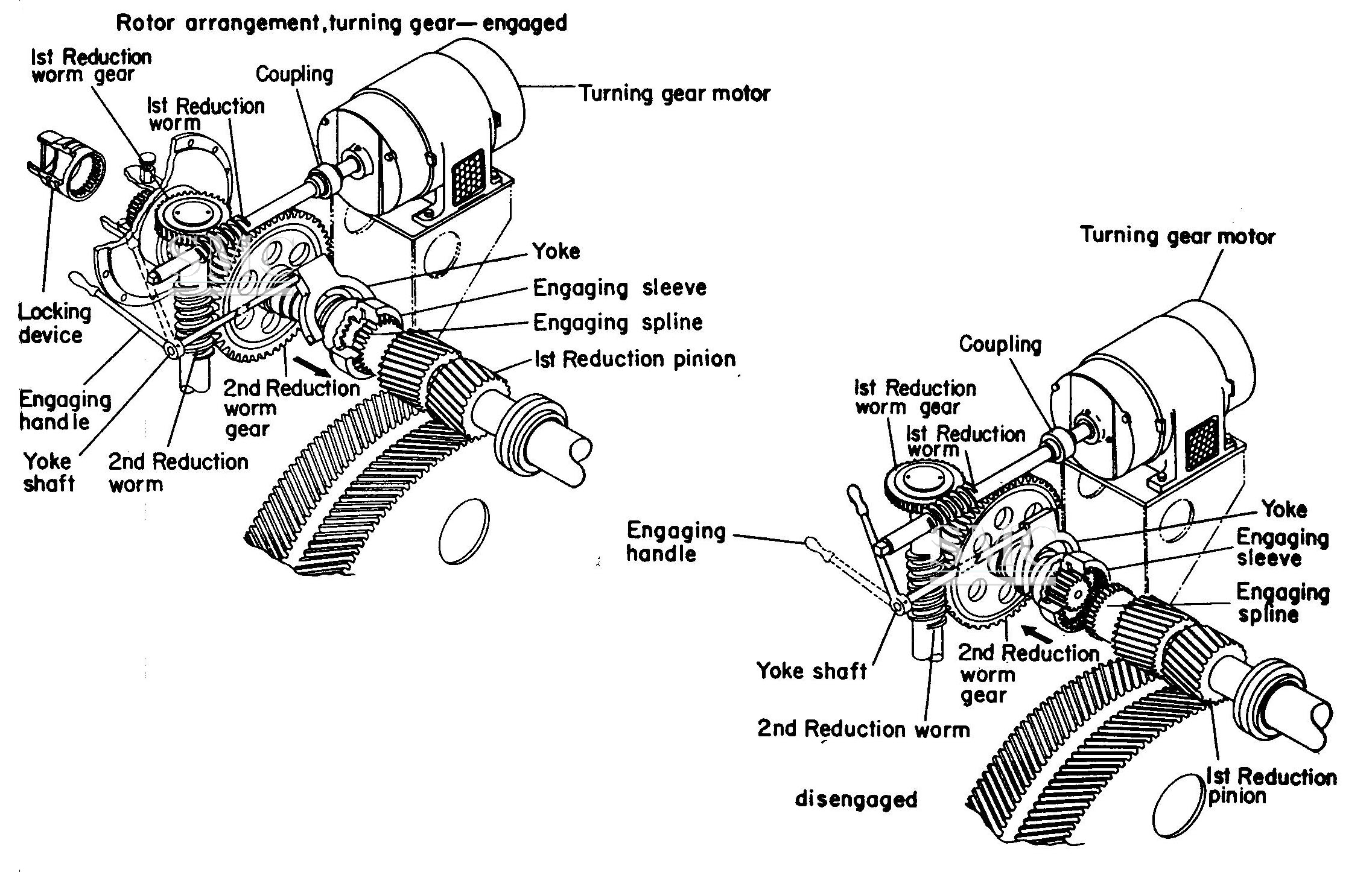 This allows us to make sure that the casing is straight, despite lack of instrumentation that would measure casing hogging or sagging.The required minimum time on turning gear varies from station to station, reflecting the operating experience of the turbine manufacturer. Usually, the minimum time depends on the duration of the preceding shutdown during which the turbine generator rotor was left stationary, and may reach up to 24 hours.When the turning gear is started up, its motor is energized and the turning gear drive is engaged to the turbine generator rotor.